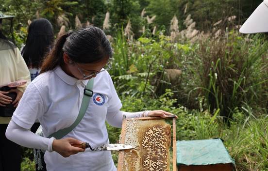 在养蜂基地,实践队员与蜂农共同劳动,蜂农的智慧和勤劳展示了农村发展的活力和希望,实践队员们也将用劳动和汗水为复原乡“甜蜜”事业贡献自己的青春力量,将所学所能致以所用,助力乡村振兴。
