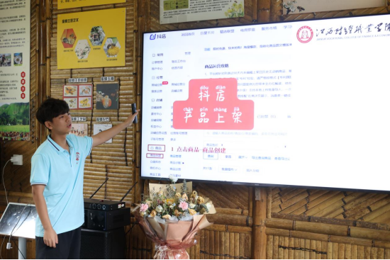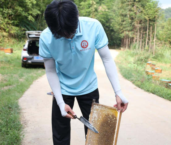 下午,实践队在中蜂养殖场开启户外直播,由江西省养蜂研究所刘锋博士为实践队员和在线网友科普蜜蜂的相关知识,并在在蜂农的指导下实践队员亲自体验了割蜜、摇蜜全过程。