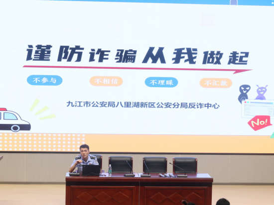 随后,八里湖新区公安局邹超警官以“谨防诈骗从我做起”为主题,为全体新生带来“开学安全教育第一课”。讲座中,邹警官通过辖区内诈骗的各项数据、常见的诈骗手法、有关法律法规,详细讲解了诈骗分子如何利用新生社会经验不足、防范心理薄弱等特点实施诈骗,让新生认识到诈骗可能就在身边,提高反诈意识,切实保护好自己的财产。