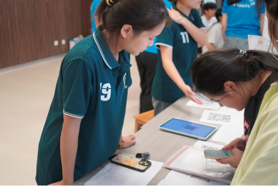 “请扫码,联系你的班主任并加入班级群”“请拿好你的军训服”“请跟我来,宿舍在这边”......校园里30名身着绿色工作服的志愿者们组成“迎新先锋队”,搭建起覆盖校门引导、行李搬运、手续指引、政策解答的全链条服务网络。在教学楼B401办公室特别设置的“家长休息区”,配备饮用水、充电设备及公司宣传手册,志愿者同步为家长讲解校园安全须知,累计协助500余名新生完成入学手续。