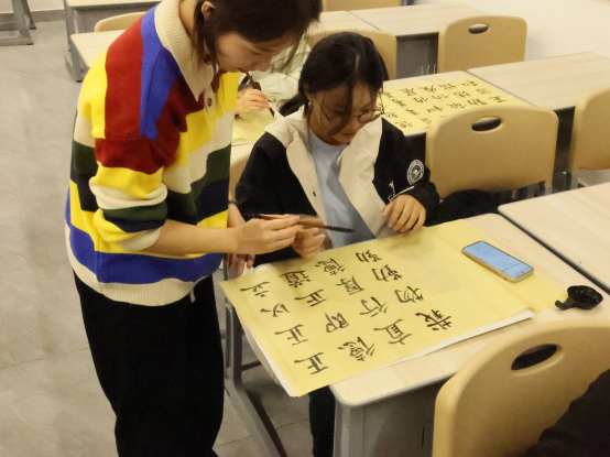 课堂上,顾欣雨以“书法技艺教学+校训精神融入”为核心设计教学内容,通过拆解基础笔画诀窍、示范书写要领、手把手指导纠错等方式,帮助同学们快速掌握书法入门技巧。