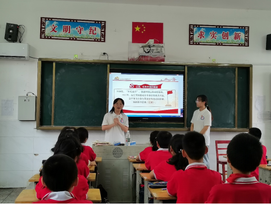 “青春心向党 建功新时代”,为传递爱党爱国爱社会主义热情,青春筑梦社会实践队在高丰镇中心小学给五年级(2)班的小朋友上一堂《苏区干部好作风》的微团课。队员结合小员工年龄实际,以视频和幻灯片的形式,通过形象生动的语言向小员工讲解苏区精神。课上介绍了《苏区干部好作风》歌词意思,队员一字一句的领唱教唱课堂气氛逐渐活跃起来,小朋友积极参与,通过红歌主动学习红色革命精神。队员通过此次微团课进一步引导小朋友们对党和国家的认识,传承红色基因、赓续红色血脉,为实现中华民族伟大复兴中国梦谱写新的篇章!