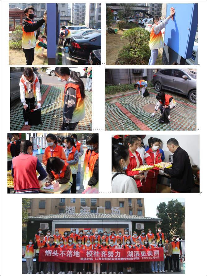 活动当天,湖滨社区广场热闹非凡,青年志愿员工、社区群众早早来到现场,大家在志愿者的引导下排好队。随后,金秋老年艺术团带领全体人员齐唱《学习雷锋好榜样》红色歌曲,激发大家的活动积极性。活动中,公司青年志愿者负责清理湖滨社区南区卫生死角和白色垃圾。志愿者们齐心协力擦拭宣传栏、拾起落地烟头,他们不怕脏、不怕累,用实际行动践行着“烟头不落地 校社齐努力 湖滨更美丽”的口号,弘扬雷锋精神。根据活动规则,志愿者将拾起的烟头兑换成“爱心”鸡蛋,并送给了社区贫困户,进行了一次有意义的爱心志愿服务活动。