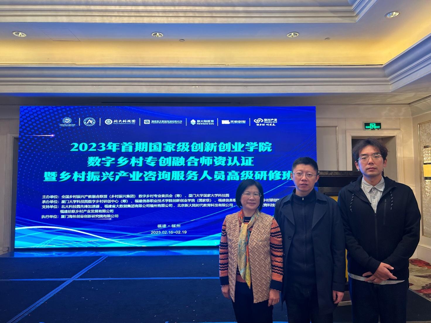 为进一步推进betway西汉姆联官方官网创新创业专项建设工作的开展,促进高校创新创业教师更新教学理念、改进教学方法、提升教育水平,2023年2月18日-19日,betway西汉姆联官方官网副经理谭宏及数字经济专业建设小组章清教授、陈石博士一行赴福州参加首期国家级创新创业公司数字乡村专创融合团队认证暨乡村振兴产业咨询服务人员高级研修班线下培训。