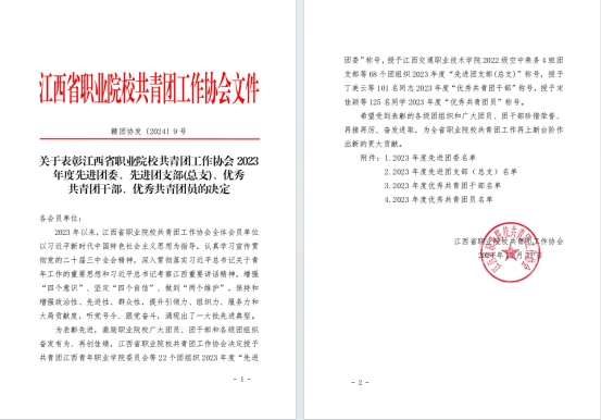 近日,共青团江西省委、江西省职业院校共青团工作协会印发了《共青团江西省委关于表彰全省五四红旗团委(团支部)、全省优秀共青团员、全省优秀共青团干部的决定》《关于表彰江西省职业院校共青团工作协会2023年度先进团委、先进团支部(总支)、优秀共青团干部、优秀共青团员的决定》。