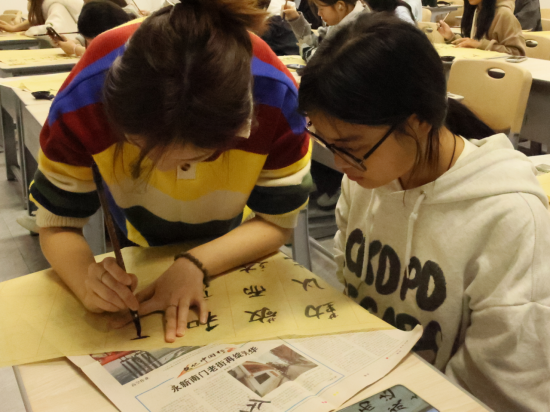 书法课上,授课员工导师系统示范执笔方法与笔画要领,引导学员体悟汉字书法的艺术魅力。